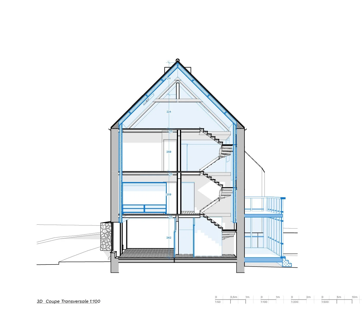 Afin de profiter des vues sur le grand paysage ainsi que d’un intérieur-extérieur, nous avons pensé un jardin d’hiver au RDC surplombé d’une terrasse donnant sur l’espace de vie du 1er étage.